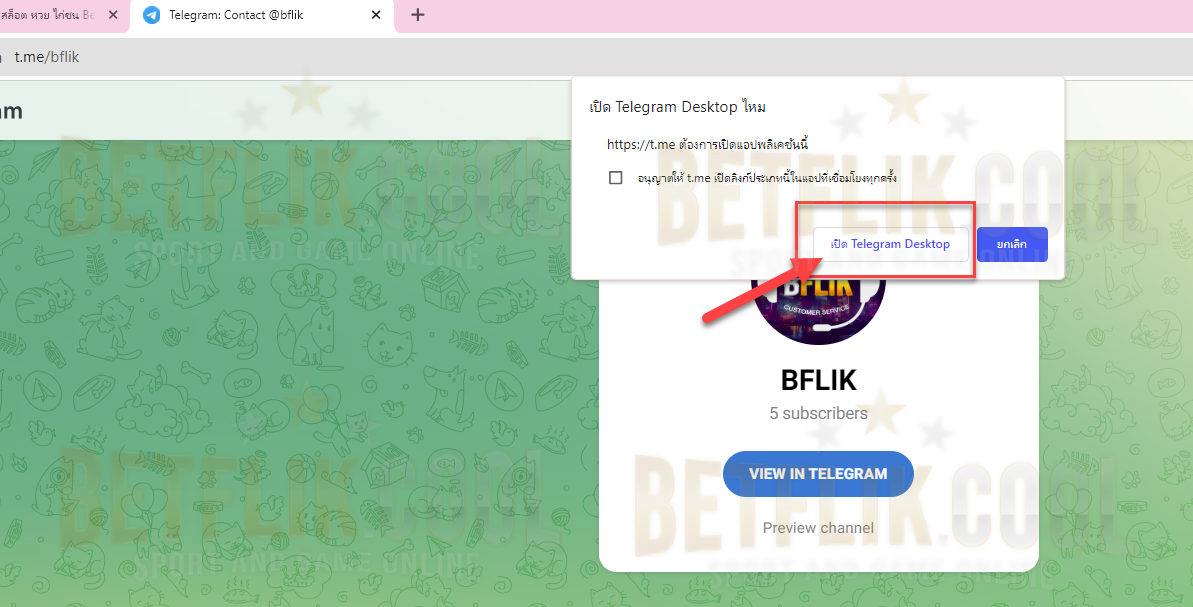 -— เมื่อกดแล้วถ้าหากเข้าด้วยมือถือจะคลิกเข้าได้เลย แต่ท่านจะต้องลงแอป Telegram ก่อนนะ แต่สำหรับ PC มันจะถามว่าต้องการเปิดหรือไม่ให้กดเปิด